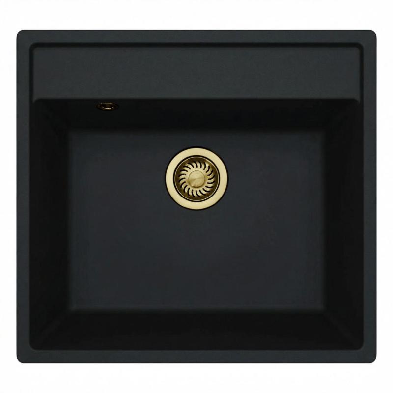 GraniteMy Bremen Granitový drez 53x50 cm Čierny - Vrchná, spodná a plochá montáž s dierou pre kohútik a zlatou zátkou 1208969969